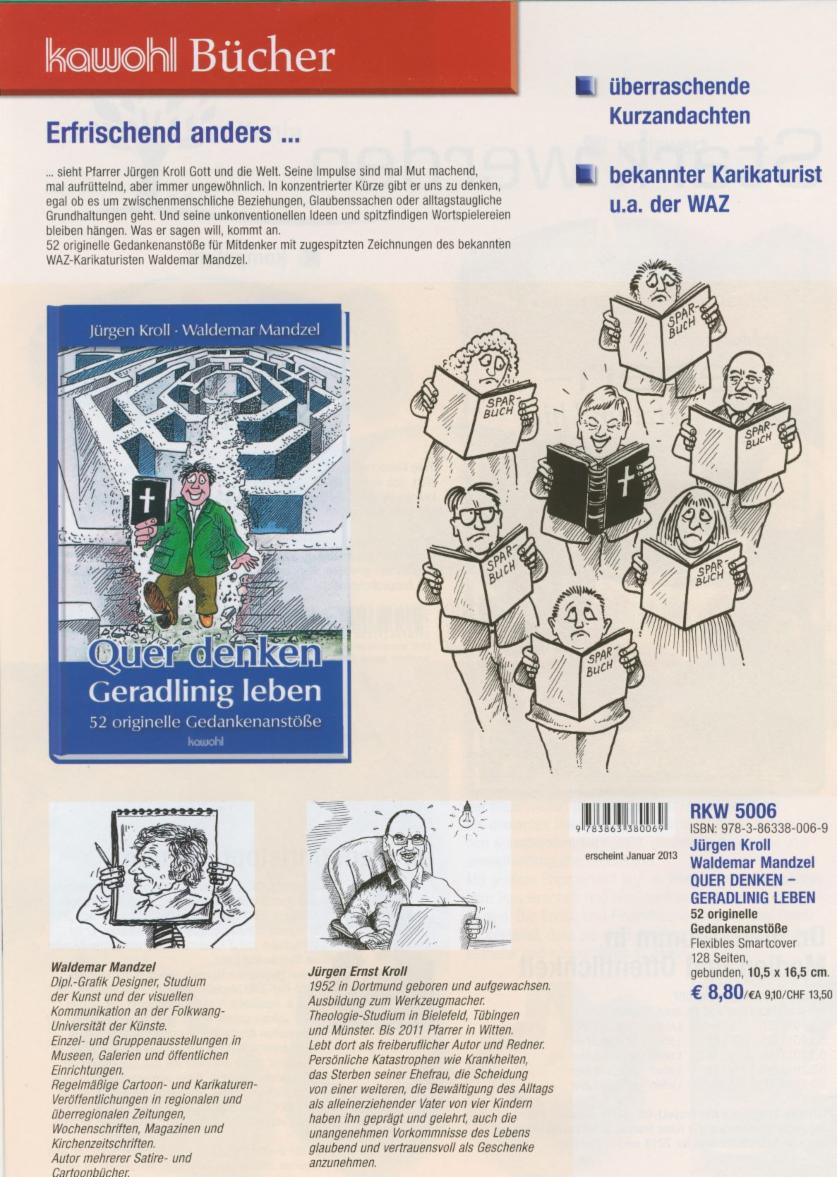 Erika Killing-Overhoff rezensiert bei amazon:Jürgen Kroll versteht es, durch knappe und knappste Sätze mich als Leser zu fesseln. Jeder Satz macht mich neugierig auf den nächsten. Er hat die Gabe, in der Kürze die Würze seiner Impulse fließen zu lassen. Mich inspirieren die Texte zum weiteren Nachdenken über den Glauben an Gott und wie ich die Welt sehe. Und das ist ja wohl die Absicht dieses gelungenen, kurzweiligen Bändchens. Und die Karikaturen von Mandzel sind auch echt witzig. Bei einigen musste ich laut loslachen, so gut sind die! Sehr empfehlenswert! Congratulations!